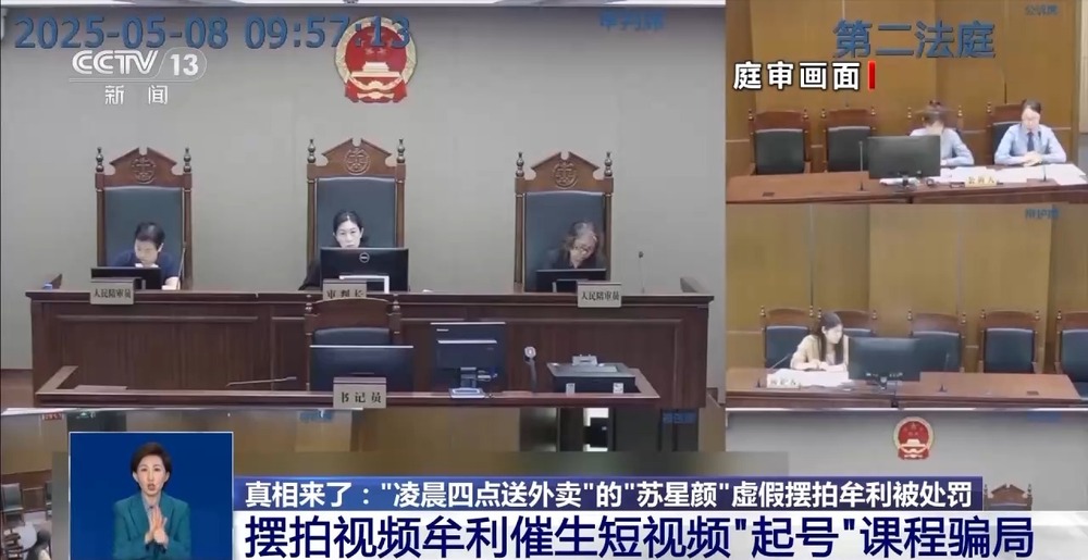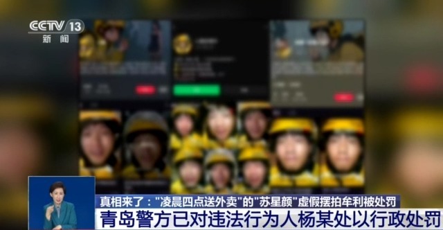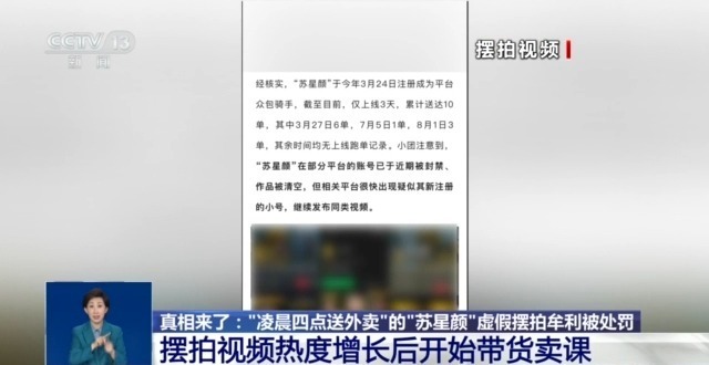 近日,公安部“净网-2025”严打网络违法犯罪专项行动公布了一起虚假摆拍造谣牟利案件,视频账号“苏星颜努力中”、“小颜拼搏中”等,自今年6月14日起更新数十条作品,在所有视频中,该博主均身穿外卖骑手工服,哭诉“后悔没好好读书”、“凌晨四点送外卖”、“每天跑十几个小时外卖”等所谓悲惨经历,引发大量网民关注和讨论,然而其真实目的却是通过刻意摆拍悲惨困境等虚假视频,误导网民关注和同情,进而通过带货、卖课等方式牟利。 以“外卖骑手”身份引流摆拍 实际仅送10单 公安部网安局介绍,经核,网民“苏星颜”真实身份为杨某,于2025年3月24日注册成为骑手,截至目前,仅上线3天,累计送达10单,其中3月27日6单,7月5日1单,8月1日3单,其余时间均无上线跑单记录。 外卖平台相关负责人 胡靖海:我们是今年6月初的时候关注到的,身穿美团的外卖骑手工作服,以骑手的身份出镜,去谈自己跑外卖的悲惨经历,其中不少视频的浏览量都是超过10万+的。经过核实“苏星颜”也就是杨某,在3月注册以来只跑了10单,他没有实际从事骑手配送,而是通过骑手这样一个身份给自己的账号进行引流增量。我们也还发现“苏星颜”相关内容,包括IP,有高度一致性的其他账号。